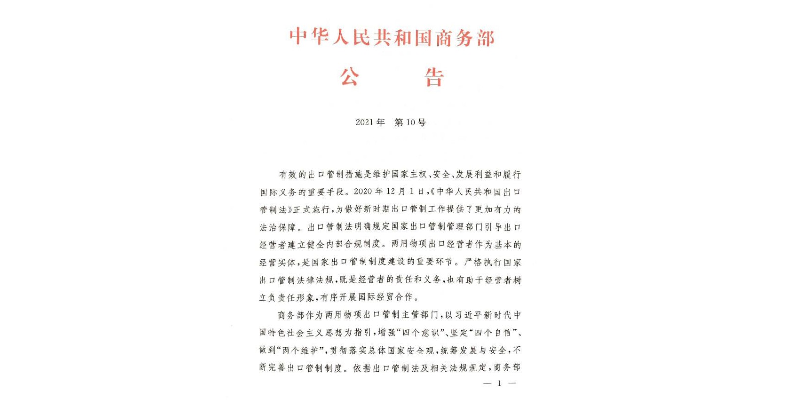 商務(wù)部2021年4月發(fā)布《商務(wù)部關(guān)于兩用物項出口經(jīng)營者建立出口管制內(nèi)部合規(guī)機制的指導(dǎo)意見》及《兩用物項出口管制內(nèi)部合規(guī)指…